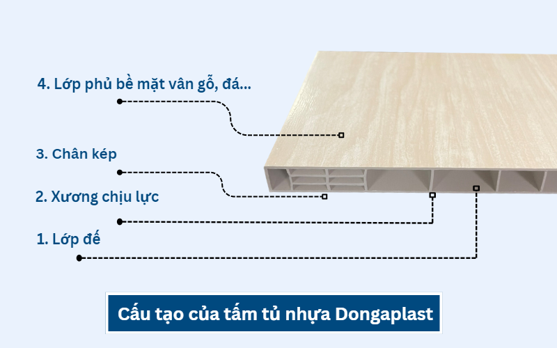 Tấm tủ nhựa cao cấp Dongaplast có kết cấu được làm từ 100% nhựa ABS lõi rỗng 2 lớp siêu cứng xếp song song nhau, khoảng cách lõi được tính toán sao cho đều và tạo nên sự cân bằng, cứng cáp tối đa cho miếng nhựa